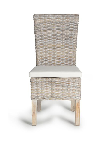 Silla de comedor Rattán respaldo alto, clásica y cálida, esta silla de respaldo alto está trenzada a mano en Rattán natural con un ligero efecto decapado que realza la fibra. La estructura de madera maciza garantiza firmeza, mientras que el cojín desenfundable en tono crudo, con lazos decorativos para fijarlo, aporta suavidad y confort en largas sobremesas. Su estética mediterránea encaja en comedores, cocinas y porches cubiertos; es ligera para mover, robusta para el día a día y añade textura orgánica a cualquier mesa de madera.