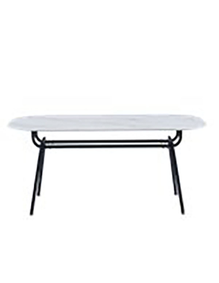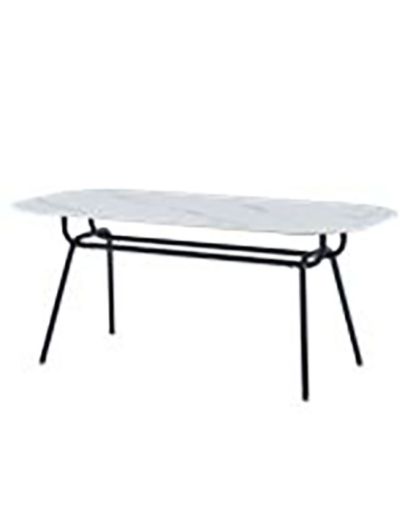 Esta mesa de comedor Lucía es rectangular, con tablero imitación mármol y cuatro patas de acero acabado negro, cuenta con un diseño que se sale de lo convencional. Sus elementos diferenciales son las piezas angulares que unen sus patas dos a dos, y que están situadas a ambos lados de la mesa, apoyados en el suelo. Gracias a estas piezas, la mesa cuenta con una superficie de apoyo mayor.