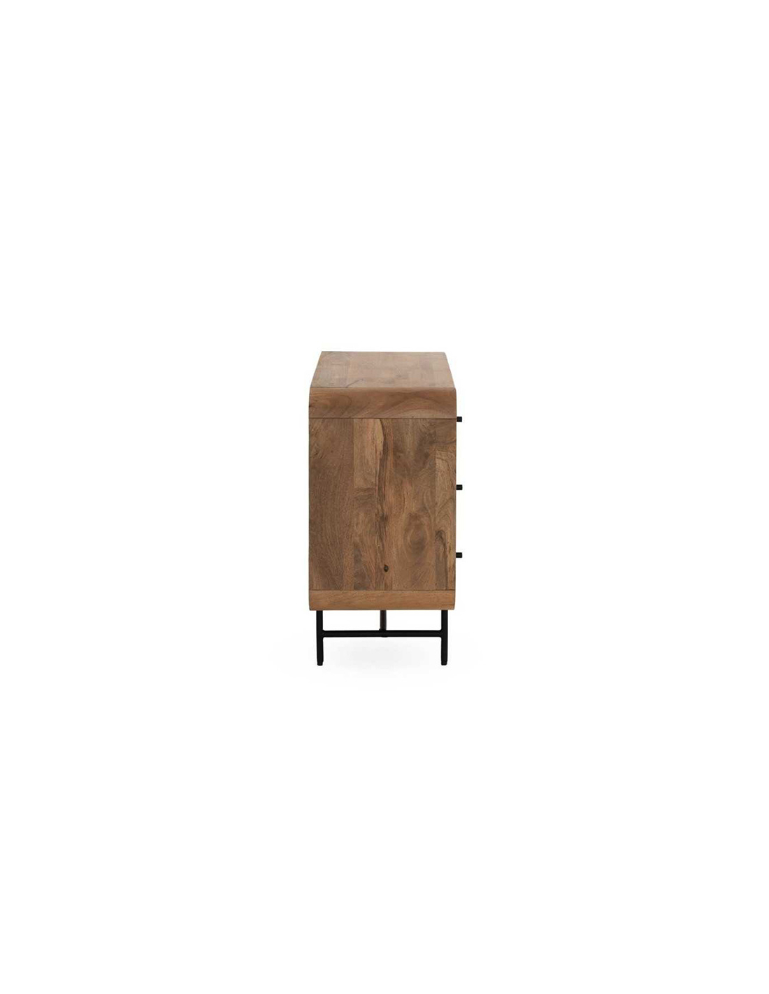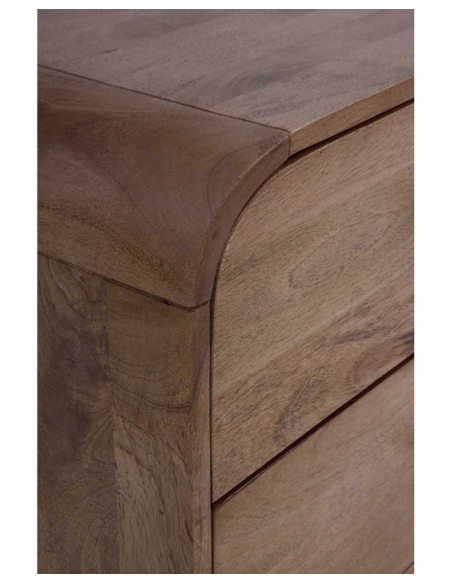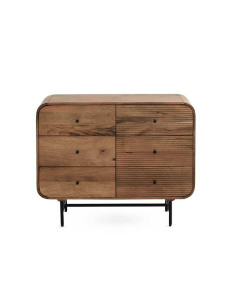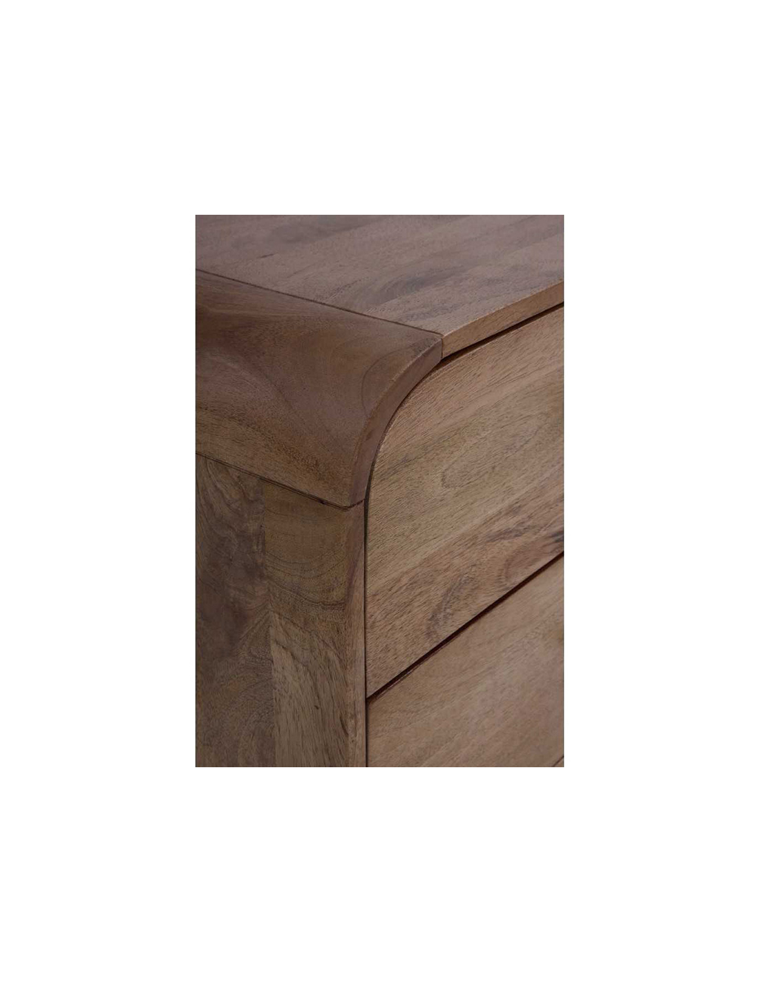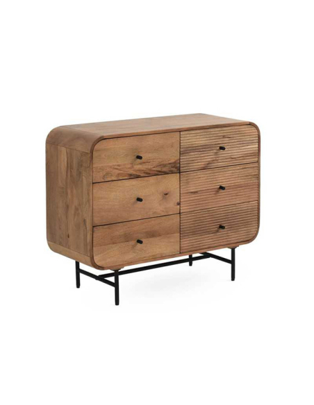 Cómoda Ágata 6 cajones, confeccionada en madera maciza de mango que garantiza durabilidad y un acabado cálido y natural. Su diseño rectangular con esquinas redondeadas aporta suavidad y estilo contemporáneo, mientras que los tiradores metálicos cilíndricos en color negro complementan la estética moderna del mueble. Los seis cajones independientes, equipados con guías de madera, ofrecen un almacenamiento práctico y accesible para ropa, accesorios o elementos del hogar, manteniendo todo ordenado y al alcance de la mano. Las patas metálicas negras aseguran estabilidad y un toque de sofisticación, convirtiendo a esta cómoda en una pieza funcional y decorativa perfecta para dormitorios, salas de estar o cualquier espacio que requiera estilo y practicidad.