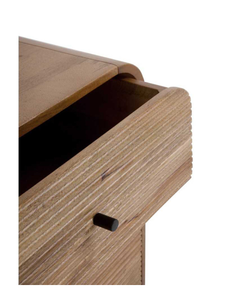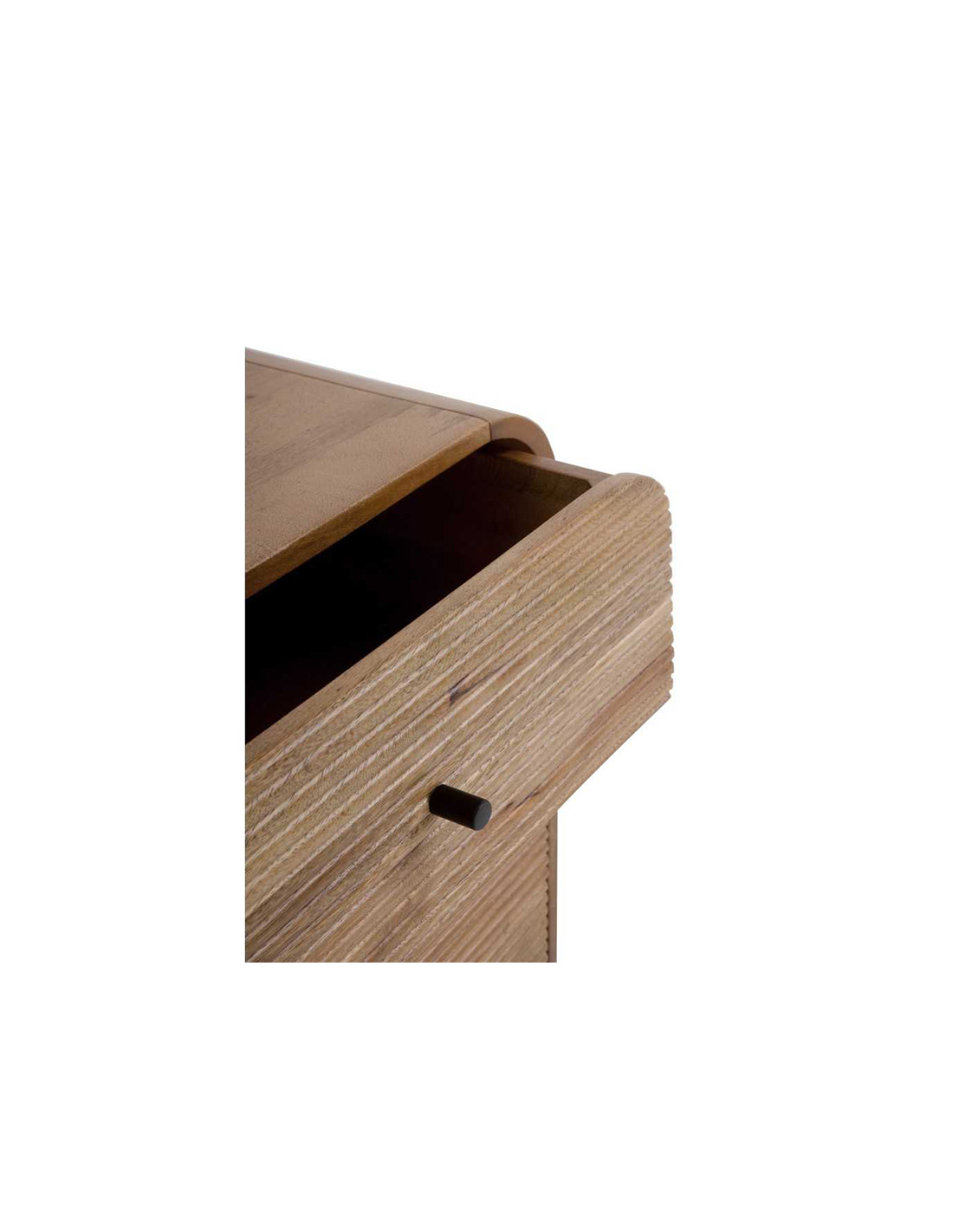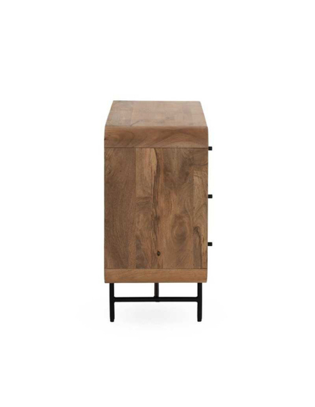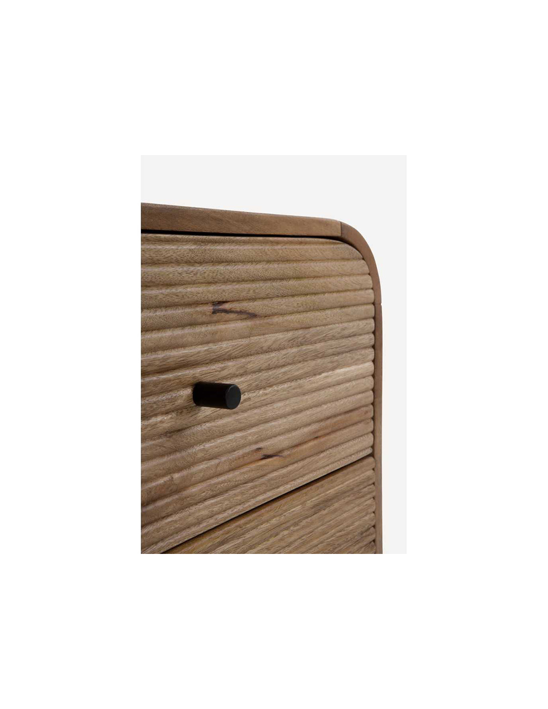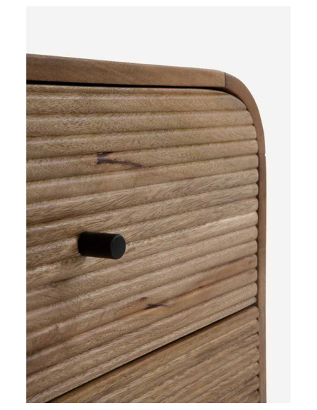 Cómoda Ágata 6 cajones, confeccionada en madera maciza de mango que garantiza durabilidad y un acabado cálido y natural. Su diseño rectangular con esquinas redondeadas aporta suavidad y estilo contemporáneo, mientras que los tiradores metálicos cilíndricos en color negro complementan la estética moderna del mueble. Los seis cajones independientes, equipados con guías de madera, ofrecen un almacenamiento práctico y accesible para ropa, accesorios o elementos del hogar, manteniendo todo ordenado y al alcance de la mano. Las patas metálicas negras aseguran estabilidad y un toque de sofisticación, convirtiendo a esta cómoda en una pieza funcional y decorativa perfecta para dormitorios, salas de estar o cualquier espacio que requiera estilo y practicidad.