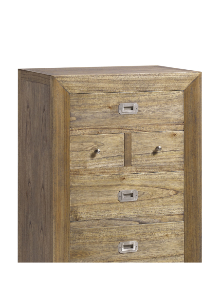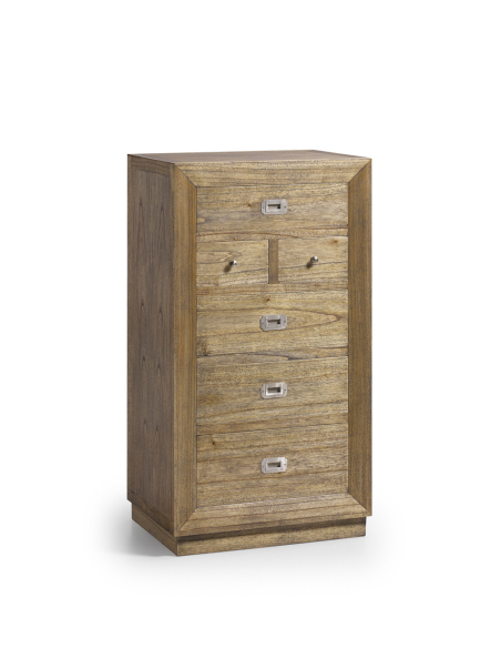 Si necesitas una capacidad extra para tu dormitorio este sinfonier Merapi con seis cajones puede convertirse en la opción perfecta. Se fabrica en madera de mindi, de aspecto bello similar al roble, barnizado en color natural. Es ideal para colocarlo en un rincón de la estancia, sacando el máximo partido al espacio. En sus cajones puedes almacenar camisetas, ropa interior, toallas, etc. Incluso, sus dos cajones pequeños, pueden dedicarse a foulards o usarlo como joyero. Rodeando los cajones, su enmarcado de madera ingletada ayuda a potenciar su aspecto robusto y de calidad. Complétalo con las mesillas, cabeceros y resto de piezas que te ofrece la colección.