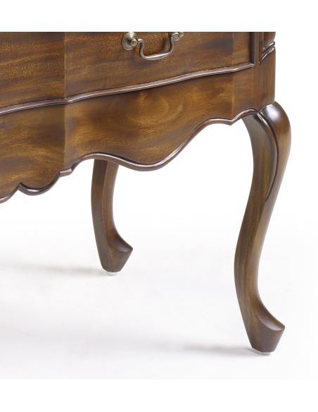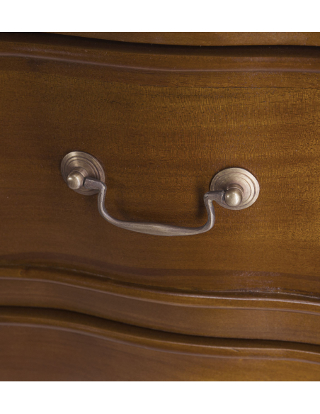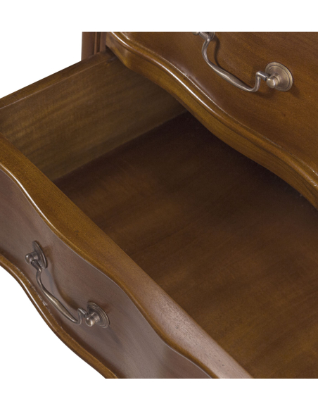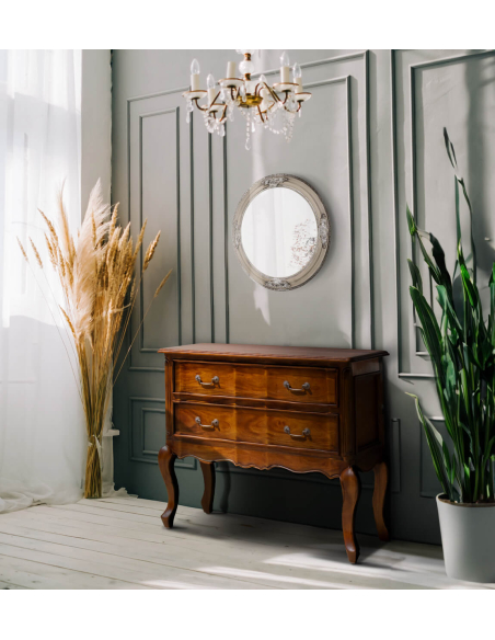 Coloca esta cómoda Vintage dos cajones en una pared de tu dormitorio y verás cómo consigues el ambiente barroco que estás buscando. Sin duda, una pieza elegante donde las haya, protagonizada por la esbeltez de sus cuatro patas torneadas de forma sinuosa, que combinan a la perfección con las ondas clásicas de los faldones. Su cuerpo de dos cajones largos es muy práctico, que te servirá para almacenar ropa de cama o tus camisetas favoritas. Combínala con la cama y las mesillas de noche de que te ofrece la colección para crear conjunto.