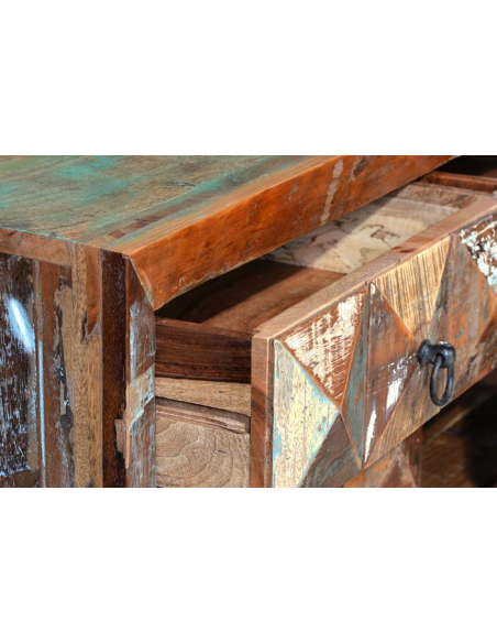 ¡Descubre con Kasas la nueva colección de mobiliario vintage fabricado en madera reciclada! Asombrosamente sencillos, elegantes y respetando el medio ambiente. Esta cuenta con esta cómoda vintage que parece una única pieza pero tiene hasta cuatro cubículos de almacenamiento. Dos cajones en la parte superior y dos armarios en la parte inferior; para guardar todo lo que necesites en el salón, comedor, dormitorio o en la entrada de tu hogar; ya sean sábanas, manteles, platos, cubiertos o libros. Un diseño novedoso y haciendo alusión a reflejos en un espejo por cómo ha sido pintado y tratado. Un dibujo reticular que sobresale con la forma de medio rombo. Con tiradores cómodos y fáciles de emplear y con unas patas de metal sencillas, planas y lo suficientemente altas para poder limpiar debajo del mueble. Como en la fotografía, podrás decorar este precioso aparador vintage con cualquier decoración, le van perfectamente colores neutros y lisos o incluso colores más vivos haciendo juego con la propia pieza, como verdes, azules, rosas o amarillos. Atrévete con cualquier composición, aquí entra la imaginación y el gusto de cada uno. También puedes acompañarlo de un espejo grande para que te ayude a hacer de la estancia una habitación más amplia o de un conjunto de cuadros o láminas, como en la foto. ¿Listo para llenar tu hogar de las mejores ideas y diseños?