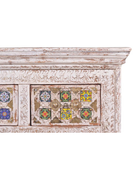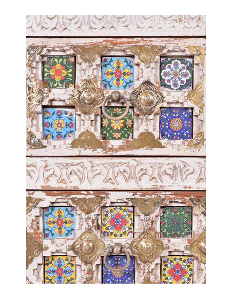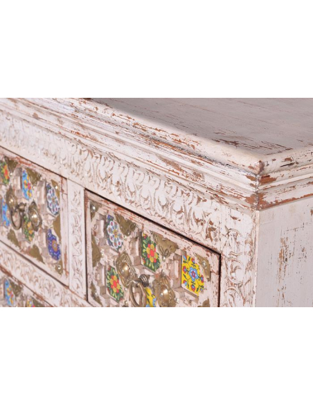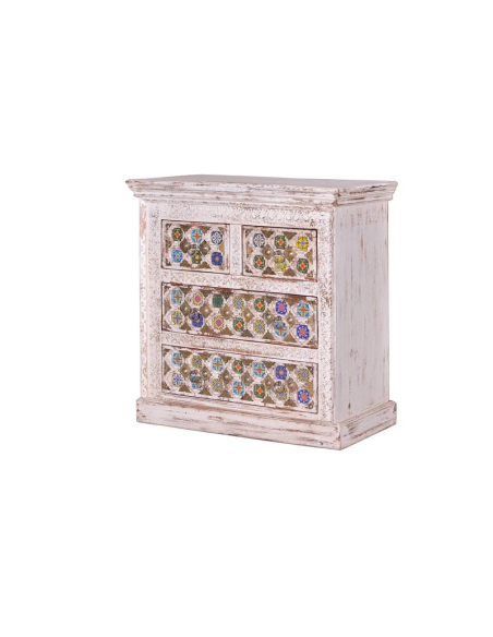 ¿Estas buscando extra de espacio para almacenar y guardar tu ropa? Te invitamos a conocer la cómoda madera mango estilo floral. Compuesta de cuatro cajones, dos grandes en la parte inferior y dos pequeños en la parte superior. Muy funcional para guardar camisetas, ropa interior y/o joyas. Con diseño muy bonito de flores combinando diferentes colores con apliques en cerámica y latón. Un mueble que viene a ras del suelo, para que no se acumule el polvo. ¡Cuando había sido más fácil!