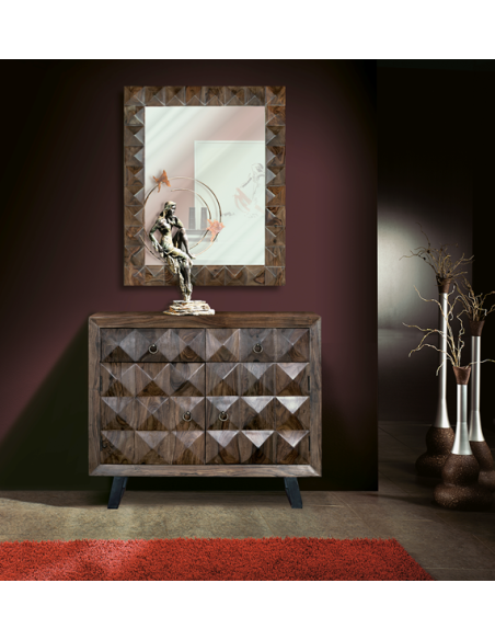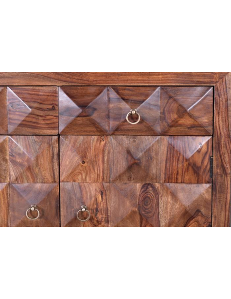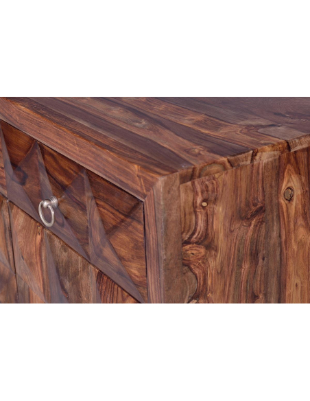 Muy elegante y sobria, la cómoda en palisandro para darle a tu hogar un toque distinguido y muy fino. Esta preciosa pieza demuestra su lujo a través de su madera palisandro y diseño de cuadros que en relieve forman rombos. Con patas altas, para hacer una fácil limpieza del suelo y para su fácil movilidad. Es un modelo versátil que impactará por su refinamiento. !Deja que tus espacios se impregnen del buen gusto de nuestra colección en Kasas decoración!