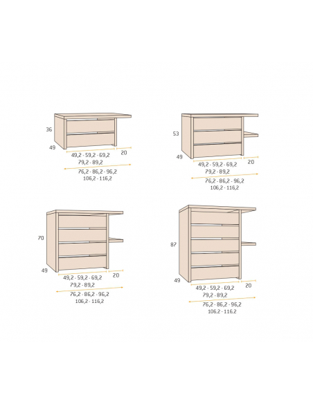 Medidas disponibles de ancho para todas cajoneras: 76,20 / 86,20 / 96,20 / 106,20 / 116,20 cm