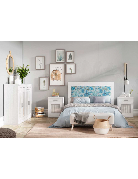 - Cabecero tapizado Coral de 150 cm + 2 mesitas de noche + 1 zapatero con visillo.