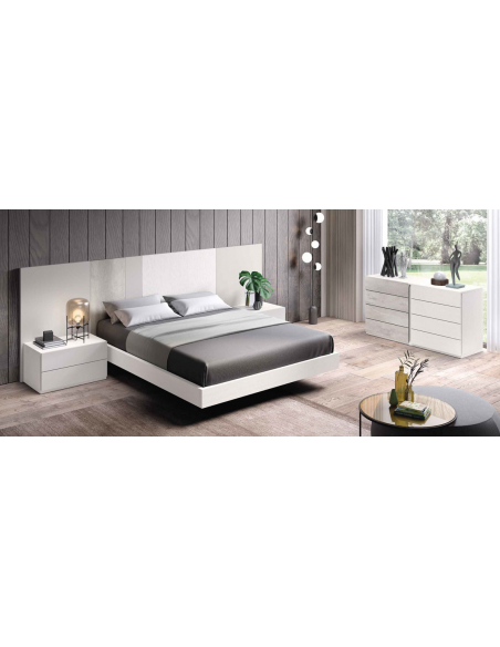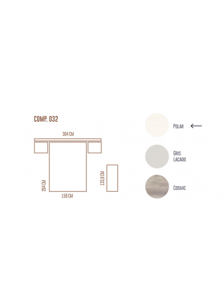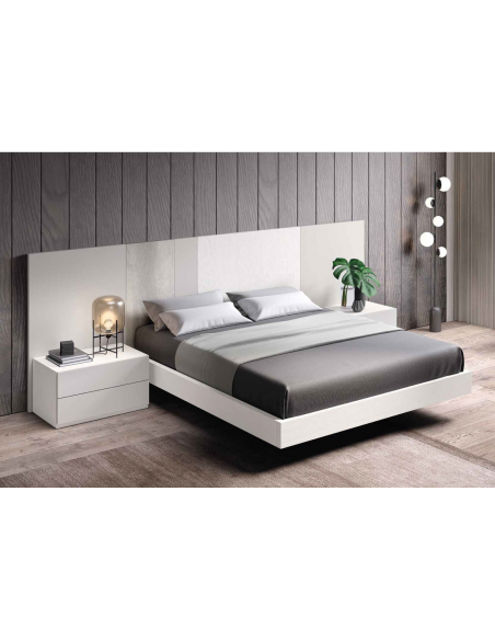 Composición de dormitorio matrimonio modelo Kasos 032 con alas para cama de 150x190 cm, todo lo que necesitas para amueblar tu zona favorita de descanso de manera moderna a la vez que sencilla. Conjunto para habitación compuesto de cabecero Kasos con alas, bancada volada recta acabado base, mesitas de noche Kúbica-19 de 2 cajones y cómoda Kúbica-19 de 4+4 cajones.