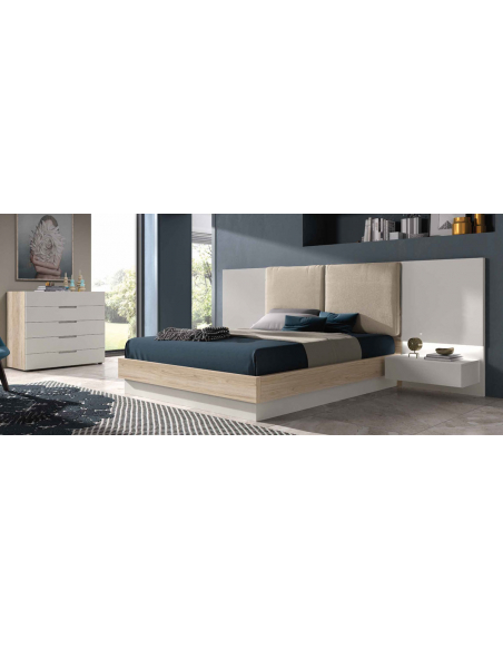 Composición de dormitorio matrimonio modelo Indy tapizado para cama de 150x190 cm, todo lo que necesitas para amueblar tu zona favorita de descanso de manera moderna a la vez que sencilla. Conjunto para habitación compuesto de cabecero Indy de 304 cm, bancada bicolor, mesitas de noche Sare de 1 cajón colgadas y cómoda Sare de 5 cajones.