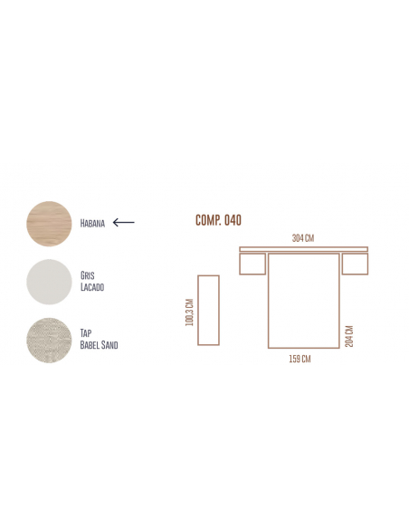 - Acabado base Habana, zonas lacadas en Gris y cabecero tapizado Bable Sand.