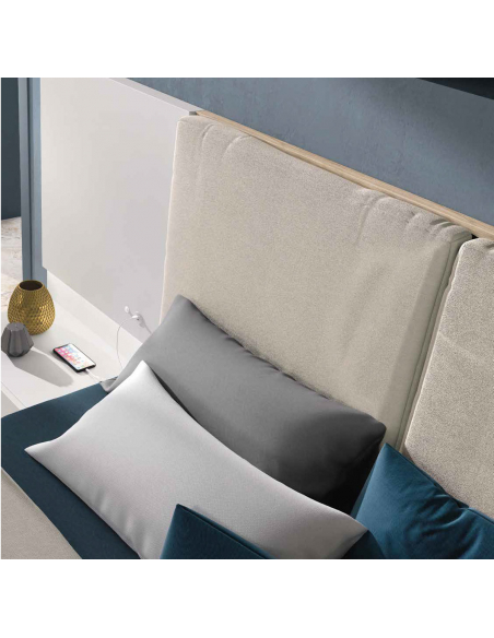 Cabecero Indy tapizado cama de 150x190 cm: → 304 cm ↖ 3,5 cm ↑ 120 cm / incluye 1 conector doble cargador USB y doble interruptor conmutado