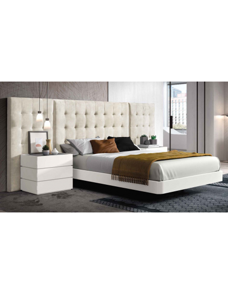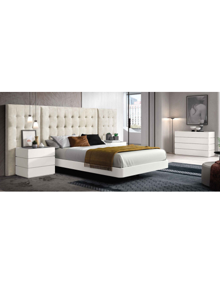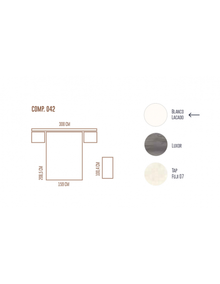 - Acabado cabecero y alas tapizado Fuji 07, mesitas y cómoda en lacado Blanco con tapa en Luxor.