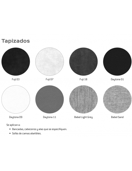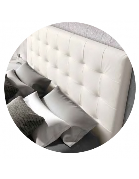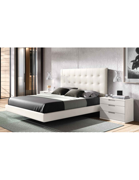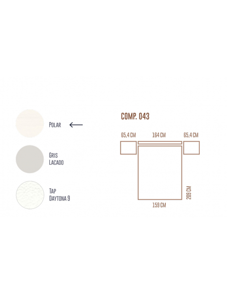- Acabado cabecero y bancada tapizado Daytona 9, mesitas base Polar con frentes lacados en Blanco, tirador embutido gris.