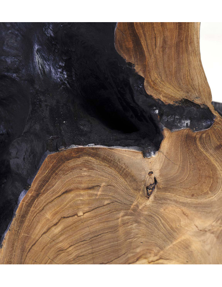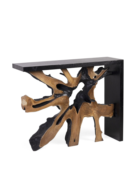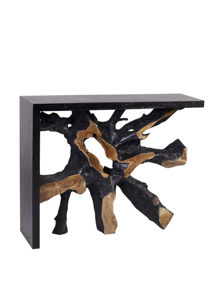 Consola teka raíz, destaca por su diseño intrincado que combina la elegancia de la madera oscura en la parte superior y lateral con una rodaja de tronco en el centro, exhibiendo las vetas y texturas naturales del árbol. Esta fusión de elementos brinda un aspecto rústico y refinado al mismo tiempo, haciendo de cada pieza un ejemplar único. Ideal para añadir un toque de calidez y carácter en cualquier espacio, es perfecta para decoraciones de estilo natural o industrial. Una mesa versátil y artística que atrae todas las miradas.