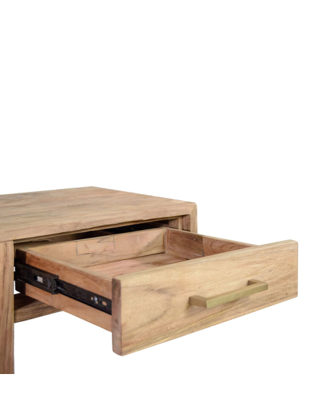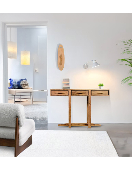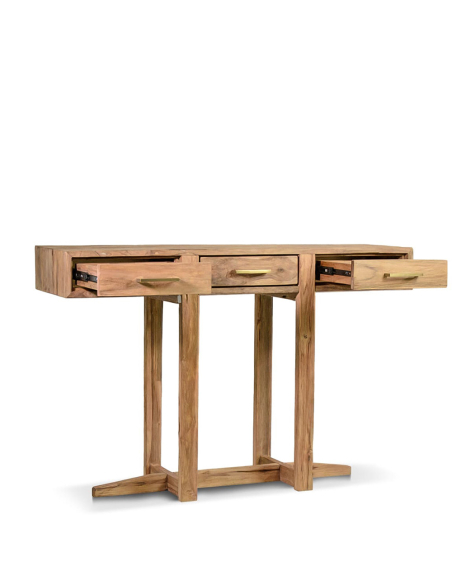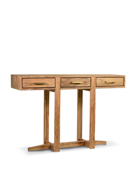Consola Orlando teka 3 cajones, con un diseño elegante y funcional, ideal para darle un toque de sofisticación a tu hogar. Con patas elevadas que proporcionan un estilo moderno y permiten facilitar la limpieza del área inferior. La parte superior cuenta con tres cajones con tiradores horizontales de metal dorados, que no solo aportan funcionalidad sino también un detalle decorativo de alta calidad. La base con refuerzo horizontal asegura estabilidad, mientras que el diseño minimalista y refinado permite que esta consola se integre perfectamente en cualquier ambiente.