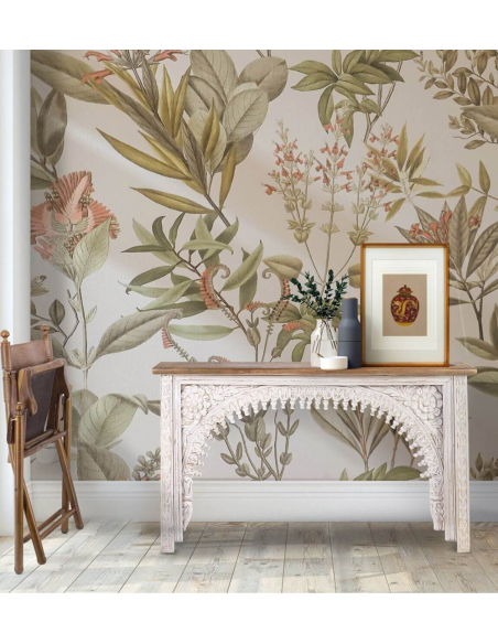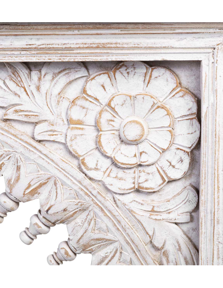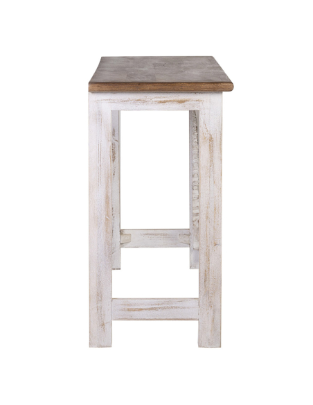 Consola Alhambra blanco, con tapa lisa ideal para un estilo rústico y elegante. Sus patas elevadas están reforzadas horizontalmente para mayor estabilidad, y el frente central presenta un intrincado calado que agrega un toque único de diseño. Las patas delanteras también cuentan con detalles tallados, que complementan la estructura. La base está pintada en blanco rústico, aportando un aire cálido y acogedor. Perfecta para complementar cualquier espacio con un