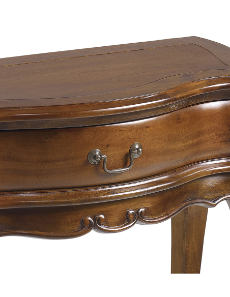 El barroco, lo clásico y lo vintage están de total actualidad en las tendencias más modernas de decoración. Por eso sabemos que la consola Suis Vintage un cajón te gustará como pieza de recibidor. Lo podrás combinar con los espejos que te ofrece la colección y verás de qué bonito conjunto puedes presumir. Su estructura de patas torneadas y sinuosas le darán el aire clásico que tanto te gusta para tu hogar. Sus único cajón está insertado bajo la encimera, quedando apoyado en una estructura de cuatro patas de forma clásica, con un trabajo exquisito de la madera maciza de caoba.