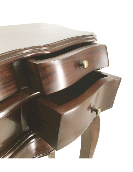 ¿Aún no conoces las piezas exclusivas que te ofrece la colección Vintage? No tardes más y podrás saborear el bonito estilo de la consola Suis seis cajones. Atrévete a combinarlo con los espejos tallados que te ofrece la colección y descubrirás la belleza del más puro estilo barroco vintage. Sus patas sinuosas y torneadas sostienen un cuerpo de formas delicadas que contiene seis cajones de perfil curvado con pequeños pomos redondos para su apertura.