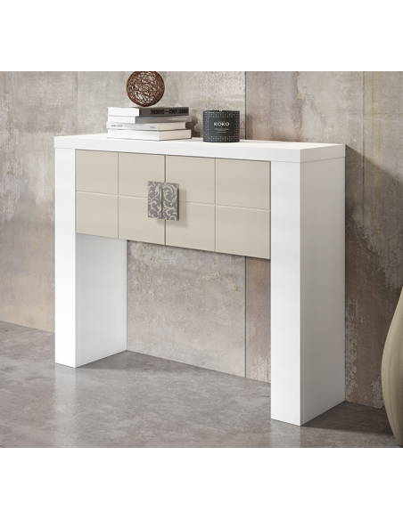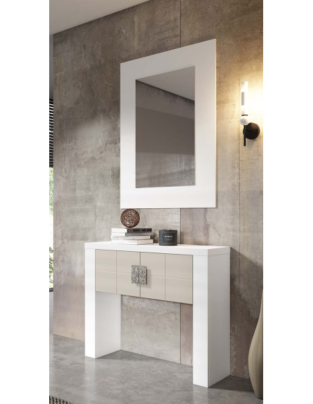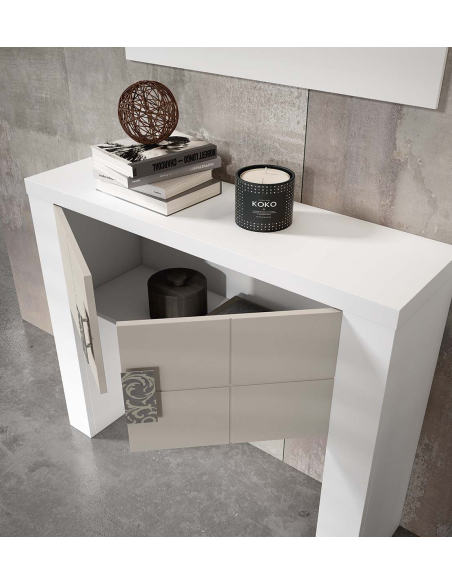 Nueva consola recibidor Gustav con tirador Musa con dibujo. ¿Buscas un mueble recibidor para mantener organizada la zona de acceso a tu hogar? Llaves, gafas de sol, moderno... Objetos que necesitan un lugar propio para encontrarlos rápidamente y evitar el caos y el desorden. Conseguir un espacio ordenado no debe hacerte renunciar al estilo y al glamour. Por fin podrás obtener el estilismo moderno que siempre has buscado para tu hogar, gracias al estilo vanguardista y elegante de este práctico mueble auxiliar. Con dos puertas de fácil acceso y tirador tipo joya, tu nueva consola es totalmente personalizable. Elige el acabado de la estructura y el de los frentes utilizando los desplegables y el cuadro de texto.