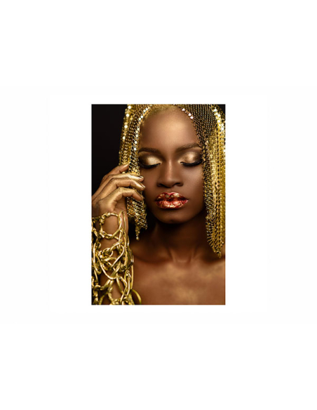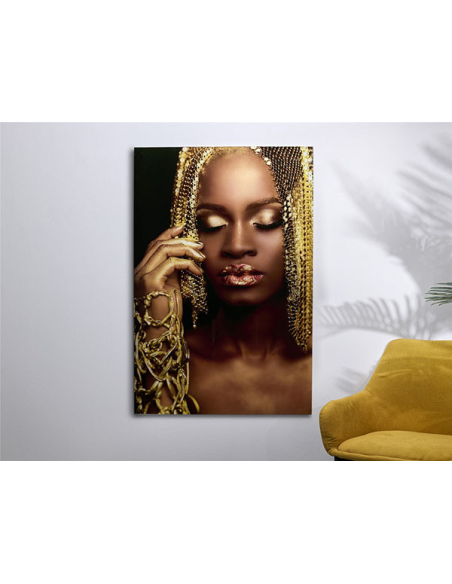Llamativo cuadro decorativo cristal impresión de mujer africana acabados dorados.