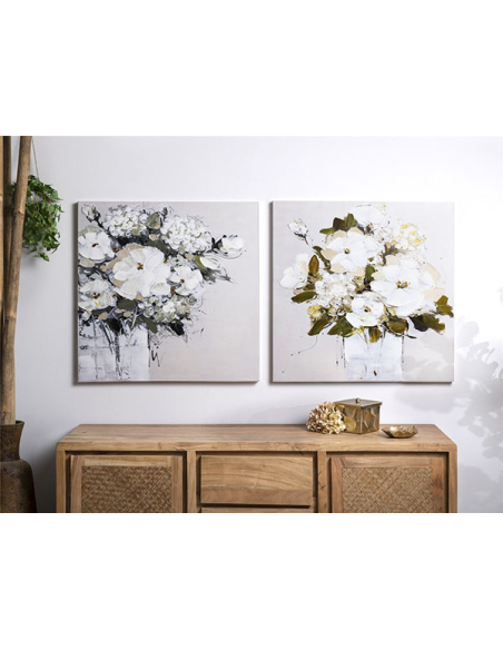 Elegante y discreto set 2 Lienzos decorativos impresos al 50% óleo con motivos de flores blancas en jarrón.