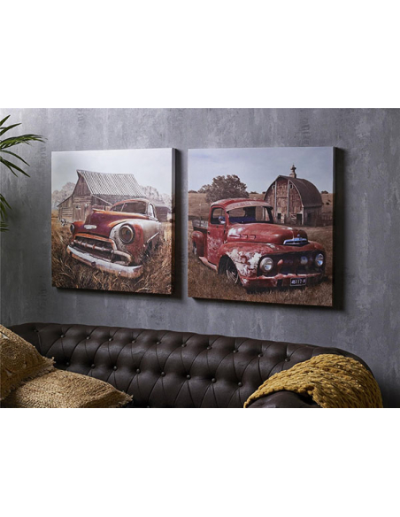 Set 2 Lienzos decorativos impresos al 50% óleo con detalle de camionetas vintage en granja.