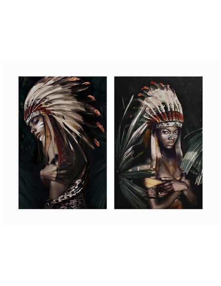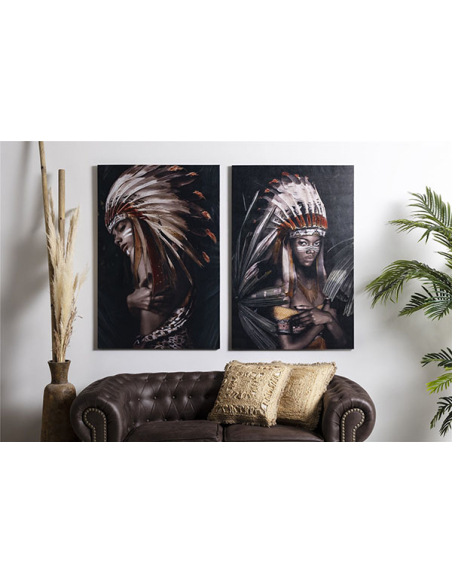 Set 2 Lienzos decorativos impresos al 50% oleo con detalle de india con plumas y el fondo negro.