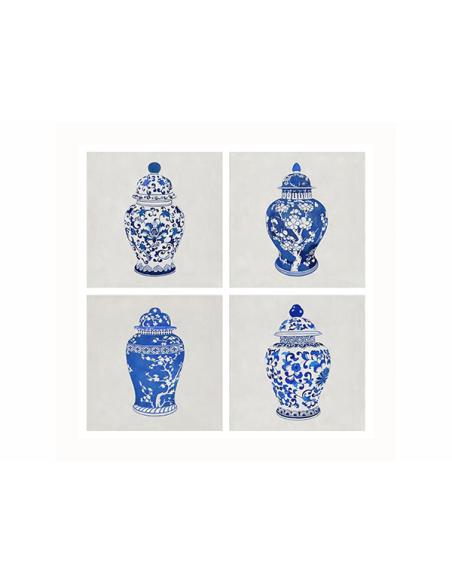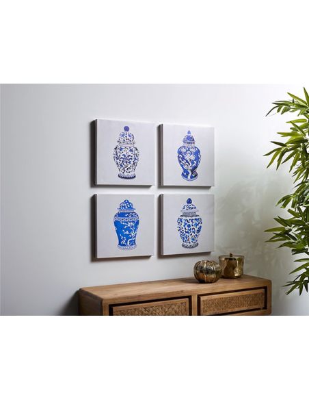 Set 4 Lienzos decorativos impresos con figuras de diferentes jarrones orientales azules.