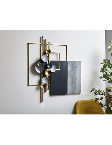 Panel decoración abstracto cuadrados con platos oro y negro y gris.