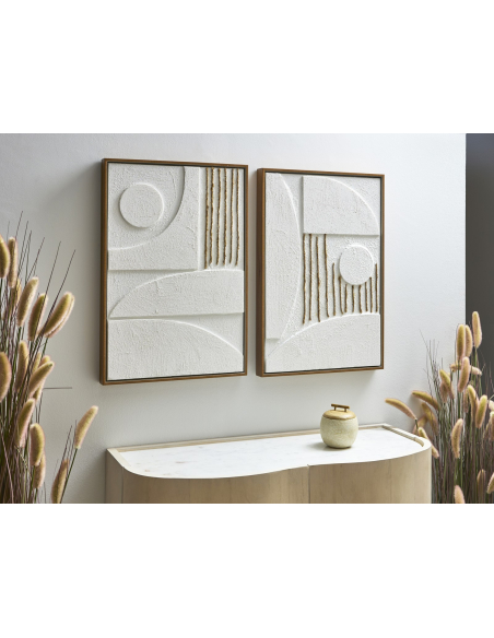 Cuadro abstracto set x 2 blanco relieve y cuerdas, esta dispuesto en forma vertical con marco a contra tono. Esta obra esta compuesta por elementos geométricos en relieve que se funden a lo largo del fondo. El relieve esta acompañado por cuerdas a contra tono dispuesta de forma vertical. Este set de cuadros transmite calma y equilibrio, ideal para crear un ambiente zen en tu espacio.