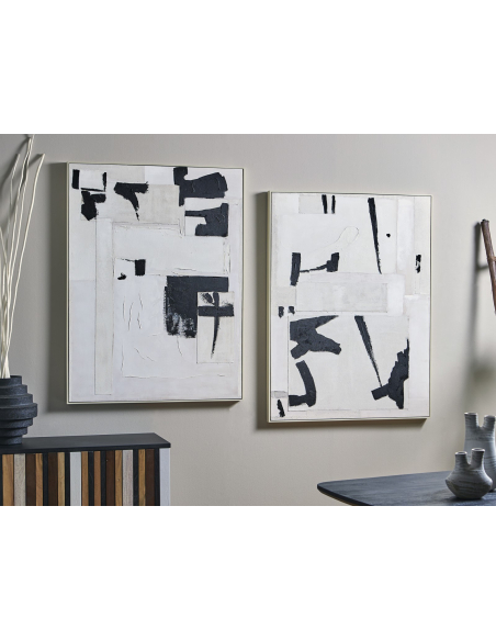 Set 2 cuadros abstractos trazos negro 92x122 cm, presentan una composición de trazos negros audaces y gestuales sobre un fondo blanco impoluto, creando un contraste impactante y lleno de energía. Los trazos, que parecen haber sido realizados con un pincel grueso o una espátula, varían en grosor, dirección e intensidad, creando un efecto visual dinámico y lleno de movimiento. El blanco y el negro, una combinación clásica y atemporal, aportan una sensación de pureza, elegancia y sofisticación. El set de dos cuadros te permite crear una composición equilibrada y armoniosa en tu pared, ya sea colocándolos juntos o por separado.