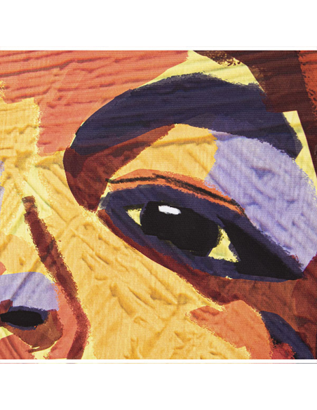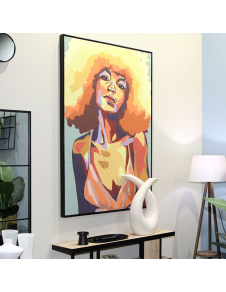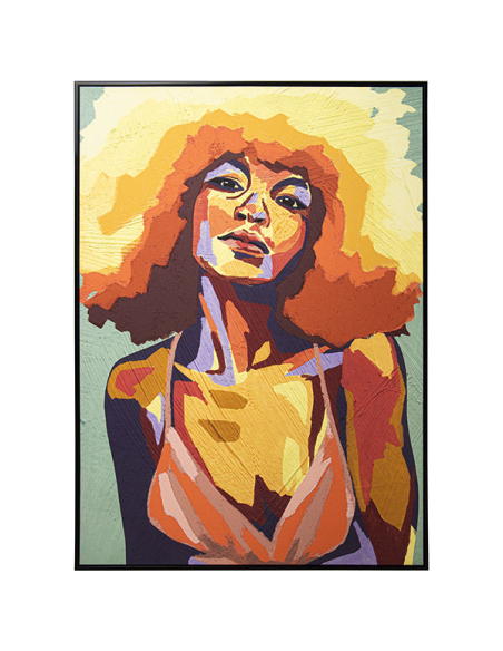 Cuadro lienzo impreso mujer amarillo con marco, este cuadro en formato rectangular presenta una base de lienzo impreso con una cautivadora imagen de una mujer creada con un efecto de pinceladas en colores rojo, amarillo y tierra, sobre un fondo verde seco. La composición vibrante y colorida resalta la figura central de la mujer, añadiendo dinamismo y profundidad visual. La estructura y el marco de madera en color negro proporcionan un contraste elegante y moderno que realza los tonos vibrantes de la obra. Equipado con un gancho metálico, este cuadro es fácil de colgar, permitiendo una instalación rápida y segura. Ideal para quienes buscan incorporar un toque de arte contemporáneo y sofisticación en su hogar, esta pieza se convierte en un punto focal que enriquece cualquier espacio con su diseño único y expresivo.