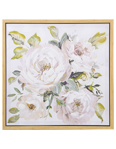 Set 2 cuadros lienzo flores primaverales 60x60 cm, en tonos rosa y verde. Los cuadros presentan imágenes de flores blancas y rosas con follaje verde, creando una atmósfera encantadora y vibrante. Listos para colgar, estos cuadros son perfectos para cualquier espacio que necesite un toque de frescura y color, ideales para salones, comedores o dormitorios.