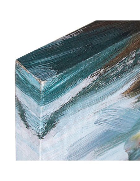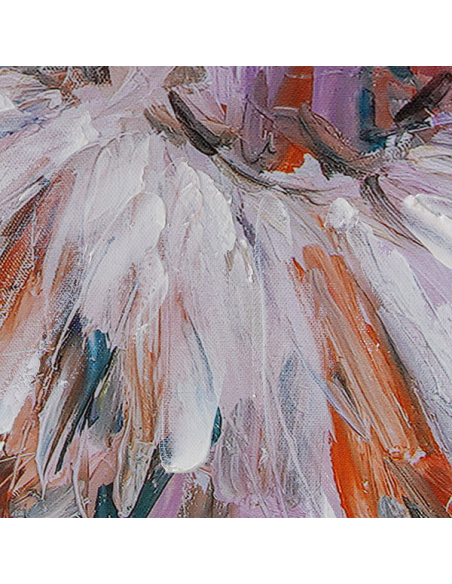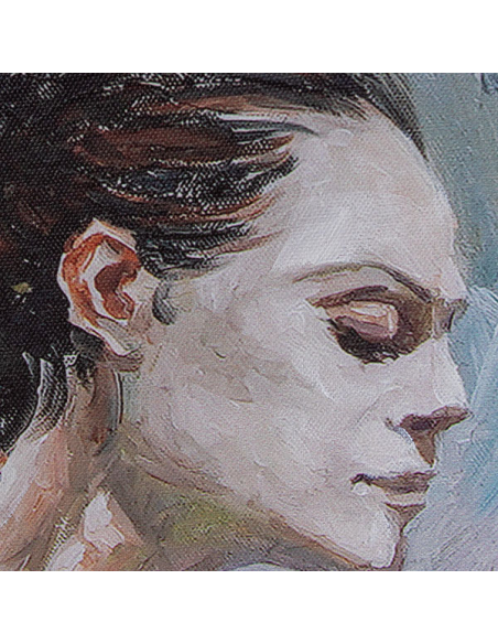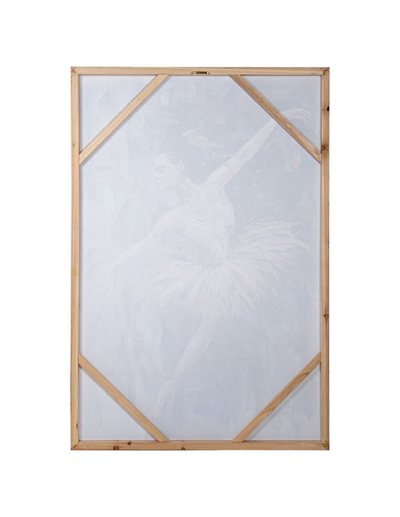Cuadro lienzo 80x120 cm bailarina, este elegante cuadro en formato rectangular presenta una base de lienzo trabajada con una técnica combinada, donde el 40% está pintado a mano, ofreciendo una obra única y artesanal. En el centro de la imagen destaca una delicada bailarina, predominando el color blanco que aporta luminosidad y gracia. A los lados, pinceladas azules sobre un fondo negro crean un contraste vibrante y profundo, realzando la figura central. La estructura de madera proporciona robustez y durabilidad, mientras que el gancho metálico facilita su colgado. Ideal para cualquier espacio que busque un toque de elegancia y arte contemporáneo, este cuadro se convierte en una pieza central que añade sofisticación y belleza a la decoración de tu hogar.