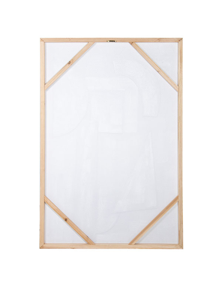 Cuadro lienzo 80x120 cm figuras abstractas , este impresionante cuadro en formato rectangular presenta una base de lienzo trabajada con una técnica combinada, donde el 40% está pintado a mano, creando un efecto único y artesanal. El diseño abstracto de figuras geométricas con efecto relieve, pintadas en un elegante blanco desgastado, añade profundidad y textura a la obra. La estructura de madera proporciona robustez y durabilidad, mientras que el gancho metálico facilita su colgado. Ideal para cualquier espacio moderno, este cuadro combina elementos de arte contemporáneo con un toque de sofisticación, convirtiéndose en una pieza central que realza la decoración de tu hogar con estilo y originalidad.
