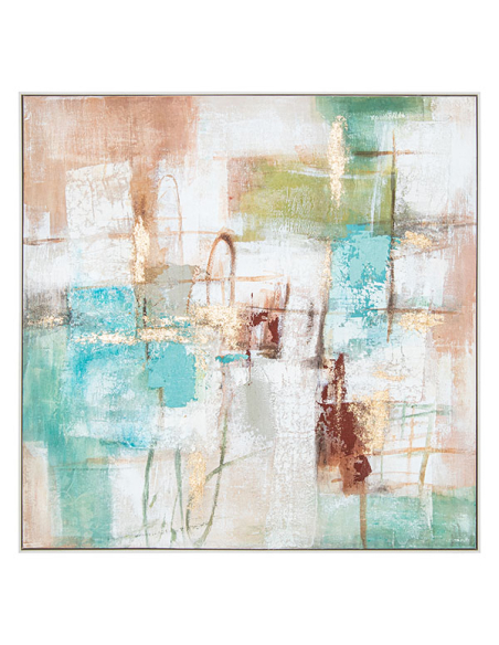 Cuadro lienzo 120x120 cm abstracto con marco cuadrados, este atractivo cuadro en formato cuadrado presenta una base de lienzo diseñada con figuras irregulares y un efecto de pinceladas desgastadas en formatos cuadrados, creando una composición abstracta y visualmente estimulante. La estructura y el marco de madera proporcionan estabilidad y un acabado elegante que complementa cualquier estilo de decoración. Equipado con un gancho metálico, este cuadro es fácil de colgar, permitiendo una instalación rápida y segura. Ideal para añadir un toque de modernidad y arte contemporáneo a cualquier espacio, esta obra se convierte en una pieza central que enriquece la decoración de tu hogar con su diseño único y sofisticado.