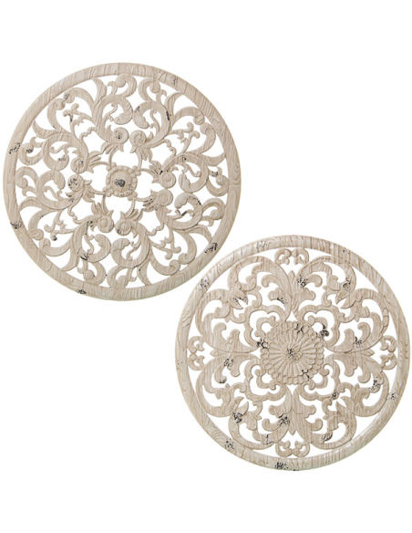 Set 2 retablos redondos calados blanco envejecido, el desgaste del color le da mayor carácter a las piezas. Estos retablos aportan un toque vintage y sofisticado, ideal para cualquier espacio que busque un acento decorativo único y con carácter. Listos para colgar, son perfectos para embellecer salones, comedores o entradas.