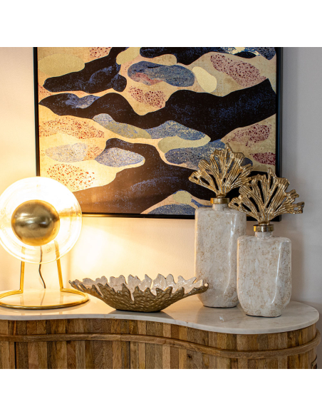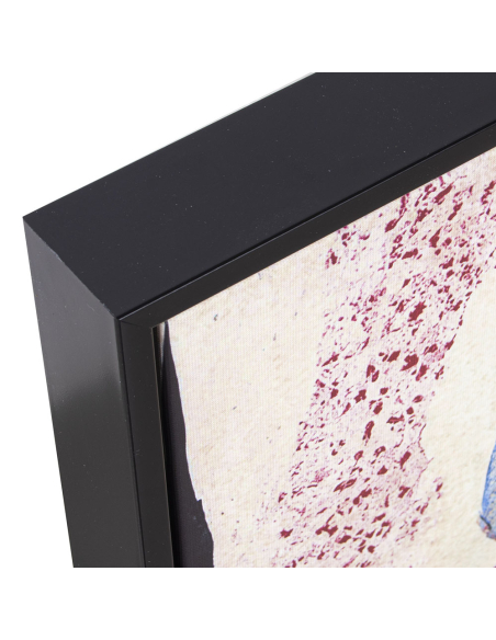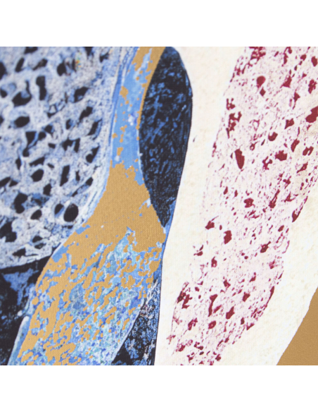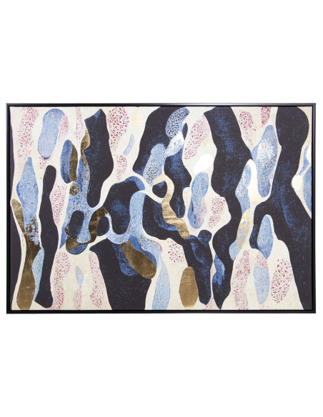 Cuadro lienzo manchas 80x120 cm, es una pieza de arte única que combina formas orgánicas y fluidas en una mezcla de colores intensos y detalles dorados. La paleta cromática incluye tonos azul, negro, beige y destellos rojizos, aportando dinamismo y profundidad a la obra. El marco de madera negra enmarca elegantemente el lienzo, destacando los patrones abstractos y dando un toque moderno y sofisticado. Es ideal para espacios contemporáneos, oficinas o salones, donde se busque crear un impacto visual fuerte y vanguardista. Su diseño abstracto permite interpretaciones personales, añadiendo interés y carácter a cualquier ambiente.
