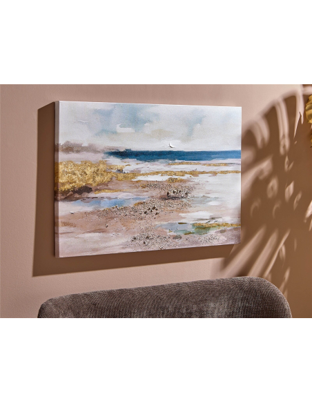 Lienzo marina reflejos oro 50% óleo 90x60 cm, esta obra de arte, con su técnica mixta que combina la pintura al óleo con toques de oro, captura la belleza efímera de un paisaje marino en constante cambio. Los tonos azules, verdes y blancos se mezclan con los reflejos dorados, creando una sensación de movimiento y profundidad. El lienzo, con su textura rica y sus pinceladas expresivas, transmite la energía del mar y la calidez del sol. Perfecto para colgar en el salón, el dormitorio o cualquier espacio donde quieras añadir un toque de naturaleza y sofisticación, este cuadro es una invitación a soñar con el mar y a disfrutar de su belleza infinita.