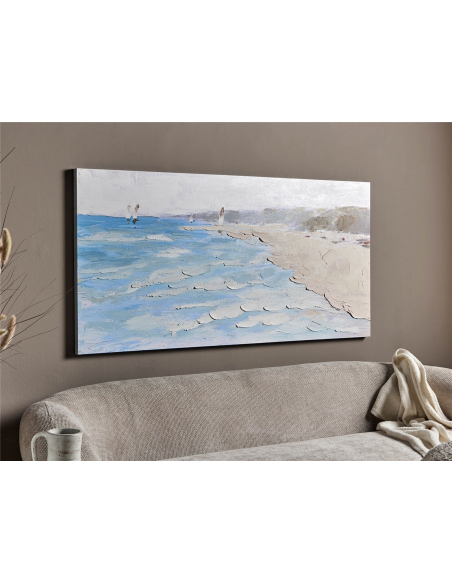 Óleo abstracto Le Mar 140x70 cm, sumérgete en la serenidad del océano con este óleo abstracto que captura la esencia del paisaje marino en una explosión de color y textura. Los tonos azules, blancos y beige se entrelazan y se funden, evocando la inmensidad del mar, la espuma de las olas y la arena de la playa. Las pinceladas, cargadas de materia y aplicadas con maestría, crean un efecto tridimensional que invita al tacto y a la contemplación. Este cuadro no es solo una representación del mar; es una experiencia sensorial que te transporta a la orilla, donde puedes sentir la brisa marina y escuchar el sonido de las olas.
