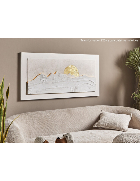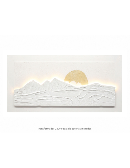 Óleo abstracto Amanecer luz led 120x60 cm, con su técnica de diferentes texturas, crea un efecto visual tridimensional y dinámico, que evoca la sensación de un amanecer en la montaña. La luz LED, integrada en el cuadro, realza los colores y las texturas, creando un ambiente mágico y acogedor. El sol dorado, que emerge tímidamente tras los relieves, es el punto focal de la obra, transmitiendo una sensación de esperanza y renovación. Este cuadro es perfecto para añadir un toque de arte y calidez a cualquier espacio, ya sea en el salón, el dormitorio o incluso una oficina.