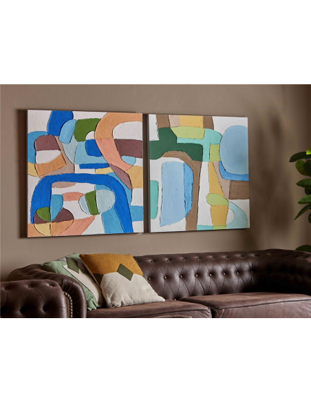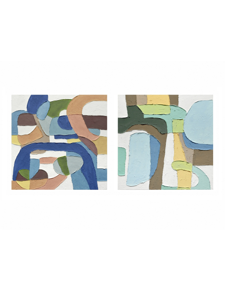 Set 2 óleos abstractos Pasta color 80x80 cm, es una explosión de color y dinamismo. Con formas geométricas y una paleta vibrante, estas obras aportan energía y un toque contemporáneo a cualquier espacio. La técnica empleada, que incluye pinceladas expresivas, crea una rica textura visual. Los colores, distribuidos de manera equilibrada, generan un conjunto armónico, que no desentona con la decoración del ambiente. Perfectos para ser colgados juntos o por separado, estos cuadros son ideales para quienes buscan añadir una pieza de arte moderna y llena de vitalidad a su hogar.