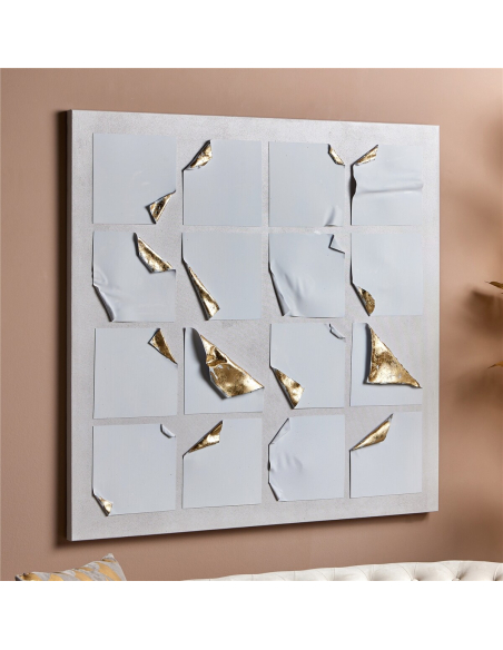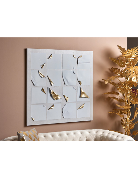 Lienzo abstracto cuadrado oro 100x100 cm, juega con la luz, la textura y la ilusión de movimiento, creando una experiencia visual única y cautivadora. Esta obra de arte abstracta presenta una composición de láminas blancas, que simulan estar despegándose del lienzo, revelando un fondo dorado brillante. El contraste entre el blanco mate y el oro reluciente crea un efecto tridimensional y dinámico, como si la obra estuviera en constante transformación. La luz, al incidir sobre las láminas y el fondo dorado, genera reflejos y sombras que cambian según el ángulo de visión, añadiendo un toque de magia y misterio. Este cuadro es perfecto para aquellos que buscan una pieza de arte que combine la elegancia con la originalidad, la sofisticación con la modernidad. Su tamaño considerable lo convierte en un punto focal ideal para cualquier espacio, ya sea en el salón, el dormitorio o incluso una oficina.