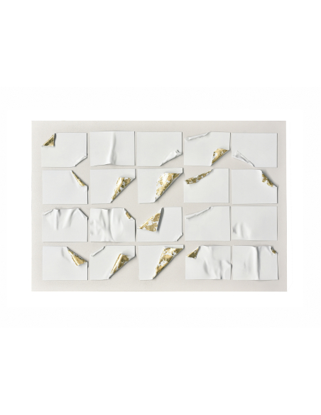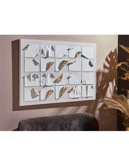 Lienzo abstracto rectángulo oro 80x120 cm, juega con la luz, la textura y la ilusión de movimiento, creando una experiencia visual única y cautivadora. Esta obra de arte abstracta presenta una composición de láminas blancas, que simulan estar despegándose del lienzo, revelando un fondo dorado brillante. El contraste entre el blanco mate y el oro reluciente crea un efecto tridimensional y dinámico, como si la obra estuviera en constante transformación. La luz, al incidir sobre las láminas y el fondo dorado, genera reflejos y sombras que cambian según el ángulo de visión, añadiendo un toque de magia y misterio. Este cuadro es perfecto para aquellos que buscan una pieza de arte que combine la elegancia con la originalidad, la sofisticación con la modernidad. Su tamaño considerable lo convierte en un punto focal ideal para cualquier espacio, ya sea en el salón, el dormitorio o incluso una oficina.