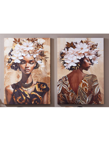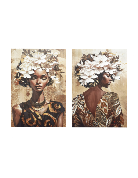 Set 2 lienzos impresos África 50% óleo 70x100 cm, un conjunto de dos lienzos que celebra la belleza y la elegancia de la mujer africana con un toque de exuberancia floral. Estas obras de arte presentan retratos de mujeres con tocados de flores blancas, que enmarcan sus rostros y resaltan sus rasgos. Los colores cálidos y terrosos, predominantes en la composición, crean una atmósfera acogedora y llena de vida. Los detalles cuidadosamente elaborados, como los adornos en la ropa y los accesorios, añaden un toque de sofisticación y realismo. El set de dos lienzos te permite crear una composición equilibrada y armoniosa en tu pared, ya sea colocándolos juntos o por separado.