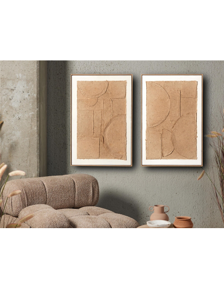Set 2 cuadros abstractos papel 60 x 90 cm, presentan una composición de figuras geométricas superpuestas, como rectángulos, cuadrados y semicírculos, creando un efecto visual dinámico y equilibrado. Los tonos tierra, predominantes en la composición, se combinan con toques de blanco y un sutil acento de azul, aportando calidez y serenidad al conjunto. La superficie de los cuadros, con una textura que recuerda al papel hecho a mano o a la tela, añade un elemento táctil y orgánico, invitando a acercarse y apreciar los detalles. Este conjunto es perfecto para añadir un toque de arte contemporáneo y sofisticación a cualquier espacio, ya sea en el salón, el dormitorio o incluso una oficina.