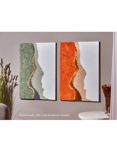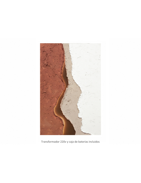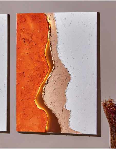 Óleo abstracto Fuego luz led 80x120 cm, una obra que fusiona la abstracción con un toque de dramatismo y luminosidad. Este óleo sobre lienzo presenta una composición de áreas de color, principalmente naranja, blanco y beige, separadas por líneas curvas y sinuosas que crean un efecto de movimiento y profundidad. La textura del cuadro es rica y palpable, con relieves que añaden una dimensión táctil a la obra. Pero el elemento más distintivo es una línea central dorada, que parece estar iluminada desde dentro, creando un punto focal que atrae la mirada y añade un toque de misterio y sofisticación. Esta línea, que divide el cuadro en secciones, puede interpretarse como un horizonte, una grieta o una fuente de energía.