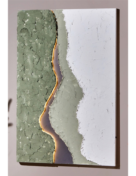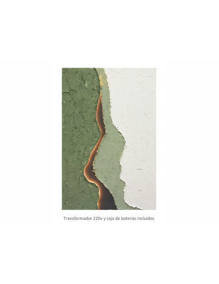 Óleo abstracto Montaña luz led 80x120 cm, una obra que fusiona la abstracción con un toque de dramatismo y luminosidad. Este óleo sobre lienzo presenta una composición de áreas de color, principalmente verde, blanco y gris, separadas por líneas curvas y sinuosas que crean un efecto de movimiento y profundidad. La textura del cuadro es rica y palpable, con relieves que añaden una dimensión táctil a la obra. Pero el elemento más distintivo es una línea central dorada, que parece estar iluminada desde dentro, creando un punto focal que atrae la mirada y añade un toque de misterio y sofisticación. Esta línea, que divide el cuadro en secciones, puede interpretarse como un horizonte, una grieta o una fuente de energía.