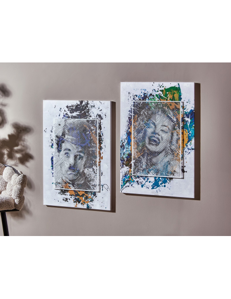 Set 2 lienzos Marilyn y Chaplin 50% oleo 60x90 cm, rinde homenaje a dos iconos del cine, Marilyn Monroe y Charles Chaplin, con un estilo que fusiona el retrato clásico con la modernidad del arte pop. Estas obras de arte presentan los rostros de estas legendarias figuras, reinterpretados con una técnica de veladura que les da un aspecto etéreo y misterioso. Los colores vibrantes y los trazos expresivos, combinados con elementos gráficos y texturas superpuestas, crean un efecto visual dinámico y atractivo. El set de dos lienzos te permite crear una composición equilibrada y armoniosa en tu pared, ya sea colocándolos juntos o por separado. Perfectos para los amantes del cine, el arte y la cultura pop.