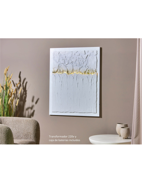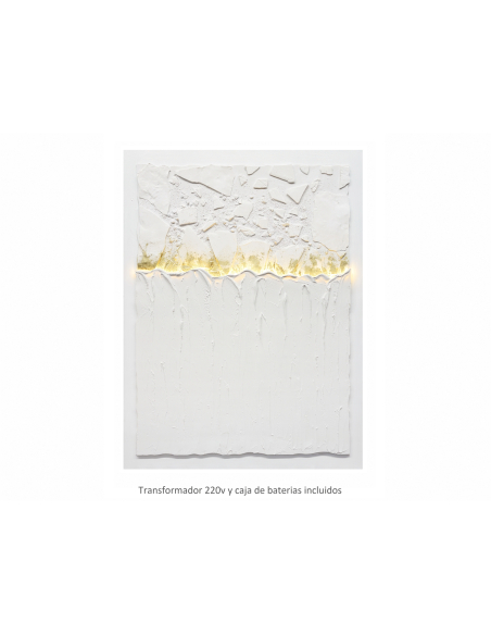 óleo abstracto relieve con luz led oro 90x120 cm, una obra de arte que fusiona la abstracción, la textura y la luz para crear una experiencia visual única y cautivadora. Este óleo, con su composición abstracta en tonos blancos, presenta un relieve pronunciado que añade una dimensión táctil y tridimensional a la obra. La luz LED, integrada en el cuadro, resalta los relieves y crea un juego de luces y sombras que cambia según el ángulo de visión y la iluminación del espacio. El toque dorado, sutilmente aplicado, añade un brillo cálido y lujoso, creando un contraste elegante y sofisticado. Este cuadro es perfecto para aquellos que buscan una pieza de arte que combine la tradición de la pintura al óleo con la innovación de la tecnología LED. Es una invitación a la contemplación y a la exploración de nuevas formas de expresión artística, añadiendo un toque de originalidad y sofisticación a tu hogar.